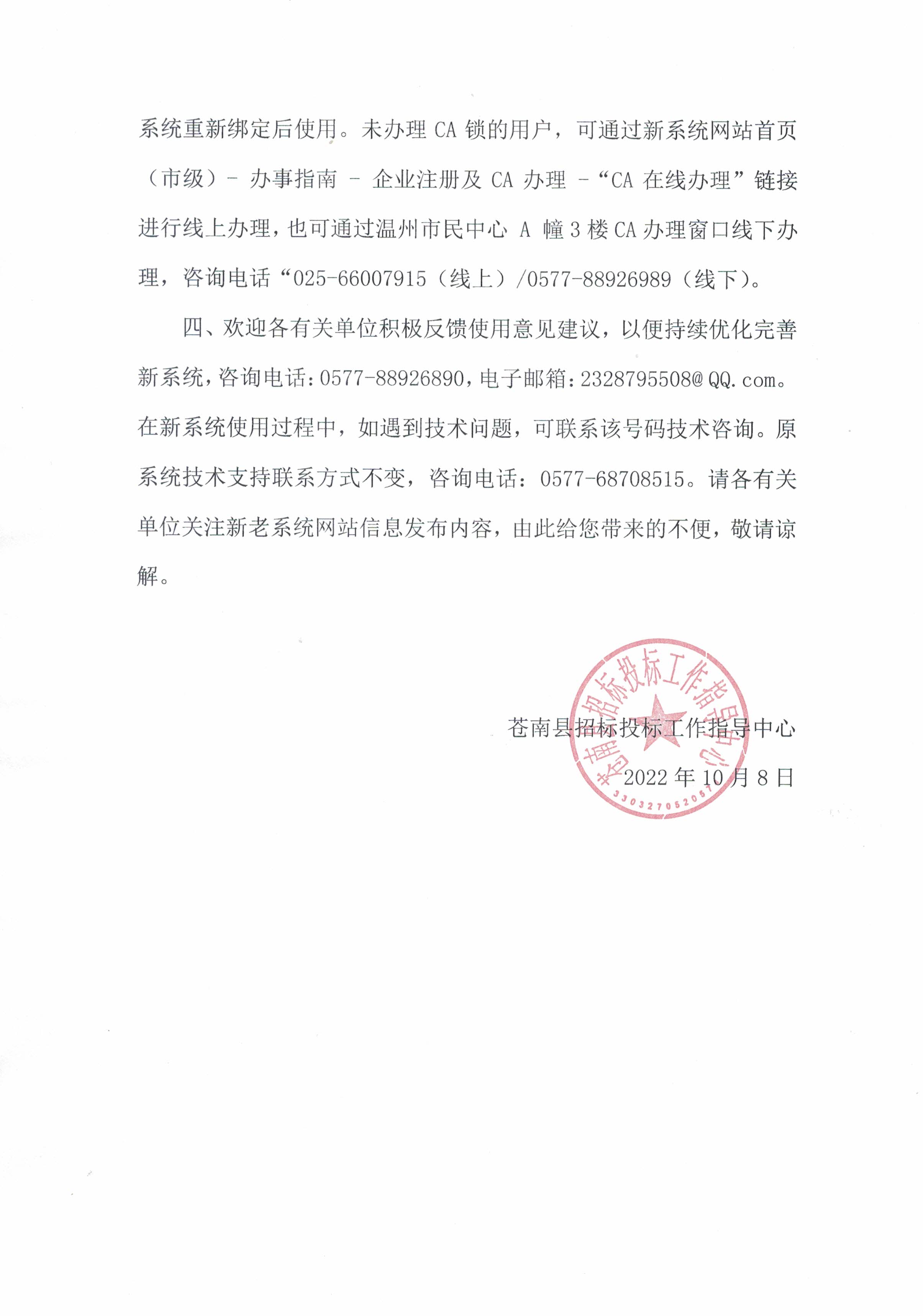 一、新系统自2022年10月8日起开放试运行。根据新老系统过渡需要,新系统网站(http://ggzyjy-eweb.wenzhou.gov.cn/col/col1229666903/index.html)暂与原系统网站(http://ggzy.cncn.gov.cn/TPFrontNew/)并行开放使用,原系统网站具体关闭时间另行通知。