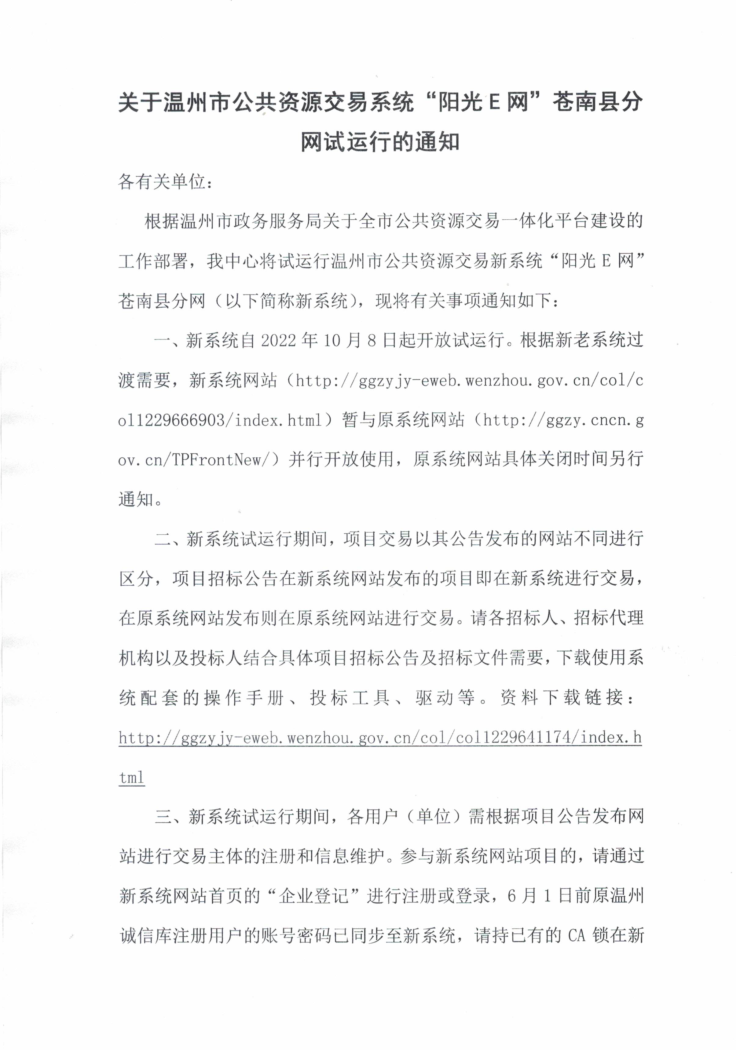 根据温州市政务服务局关于全市公共资源交易一体化平台建设的工作部署,我中心将试运行温州市公共资源交易新系统“阳光E网”苍南县分网(以下简称新系统),现将有关事项通知如下: